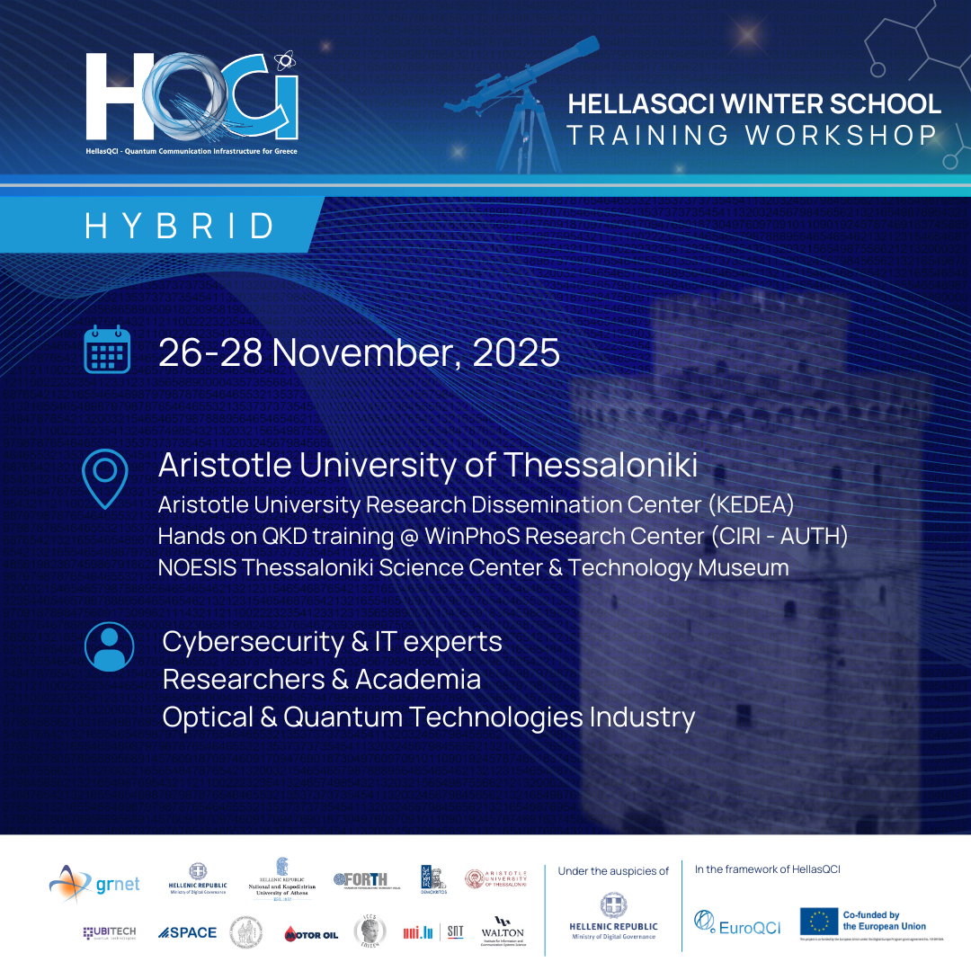 Continuing the successful series of training events in Athens and Crete, HellasQCI – a European co-funded project coordinated by GRNET – is proudly launching the HellasQCI Winter School (Training Workshop) 2025, in Thessaloniki; a FREE three-day training workshop on Quantum Key Distribution (QKD) and Space-based QKD technologies, combining theory, hands-on lab experience, and expert-led sessions.