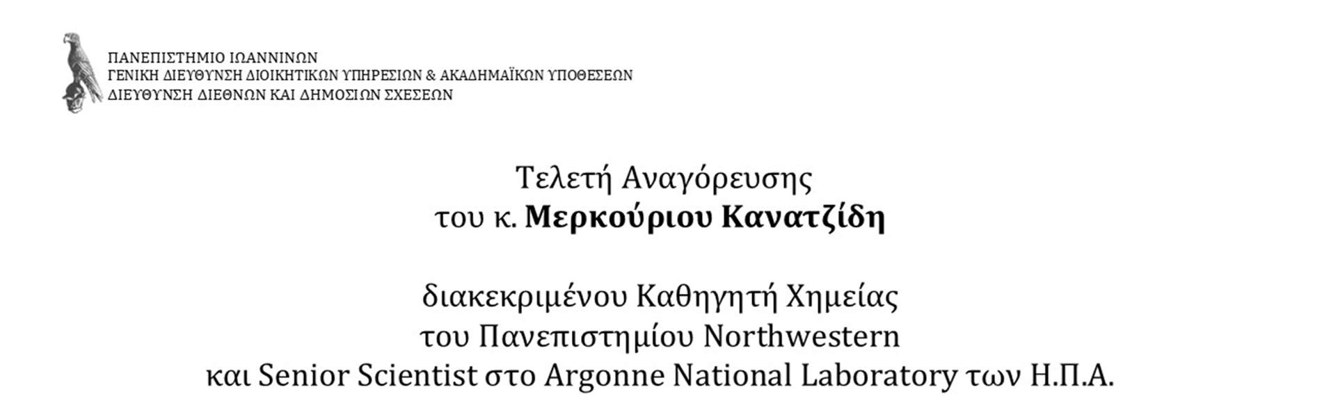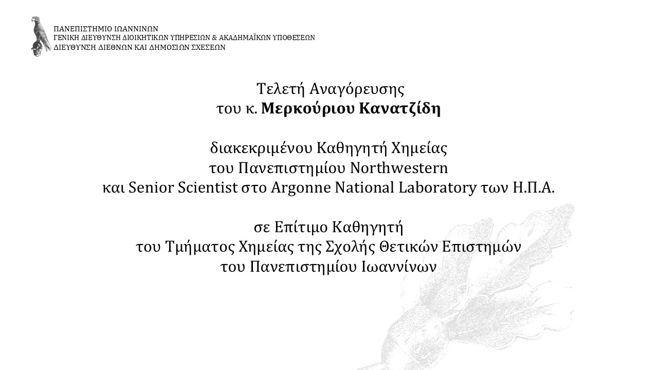 Η Πρύτανης του Πανεπιστημίου Ιωαννίνων, Καθηγήτρια κυρία Άννα Κ. Μπατιστάτου, έχει την τιμή να σας προσκαλέσει στην τελετή αναγόρευσης του κ. Μερκούριου Γ. Κανατζίδη, διακεκριμένου Καθηγητή Χημείας του Πανεπιστημίου Northwestern University και Senior Scientist στο Argonne National Laboratory των Η.Π.Α. σε Επίτιμο Καθηγητή του Τμήματος Χημείας της Σχολής Θετικών Επιστημών του Πανεπιστημίου Ιωαννίνων.