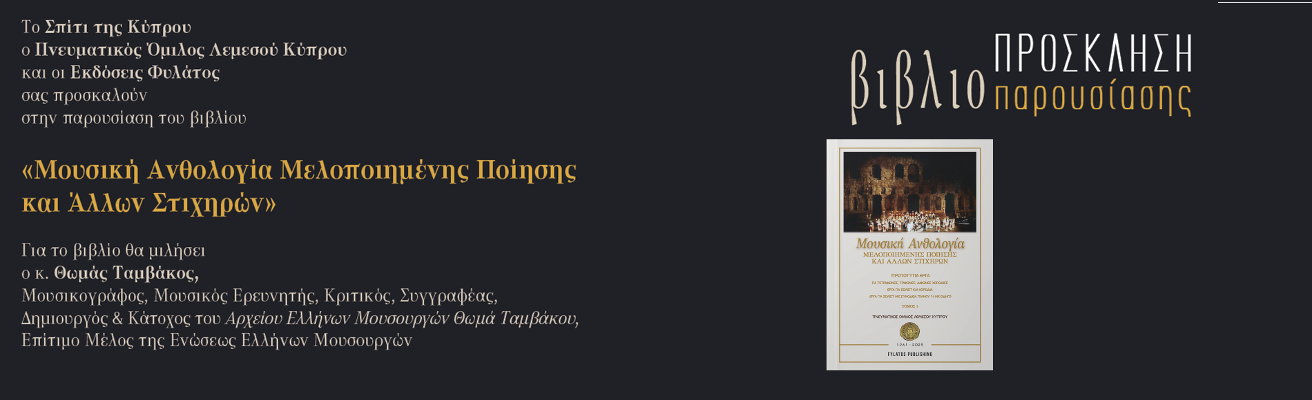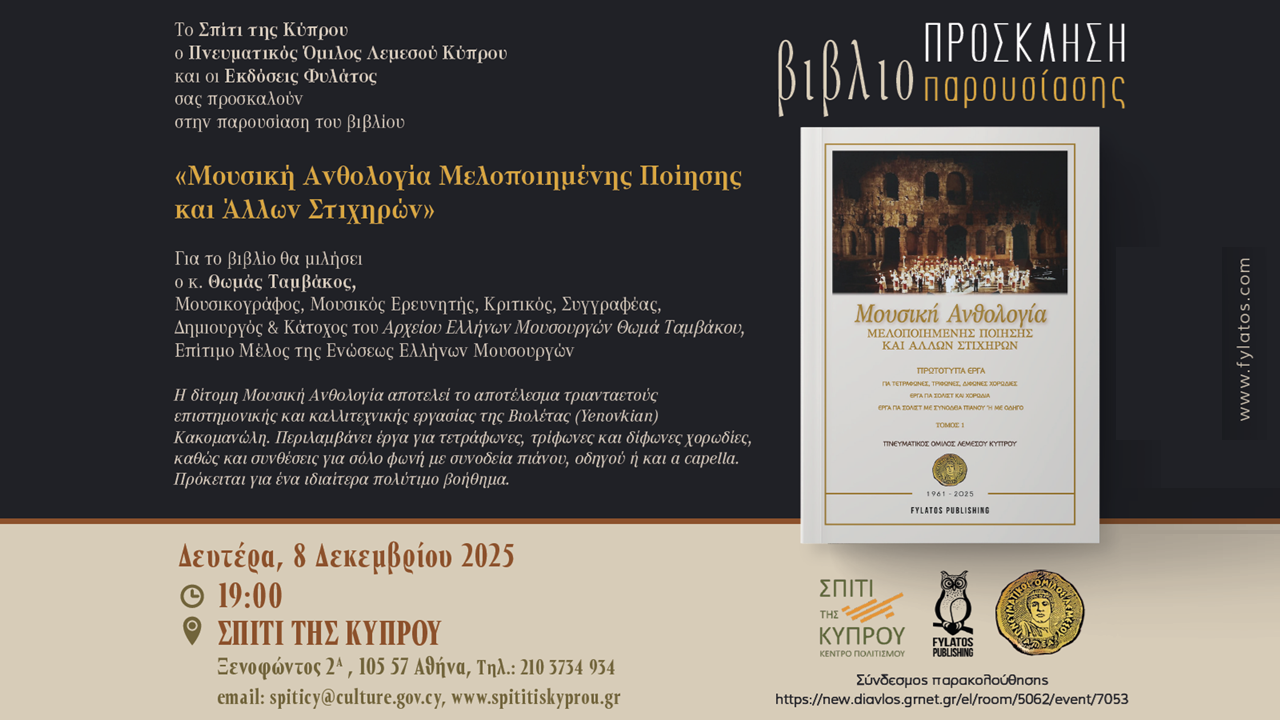 Το Σπίτι της Κύπρου, ο Πνευματικός Όμιλος Λεμεσού Κύπρου και οι Εκδόσεις Φυλάτος σας προσκαλούν στην παρουσίαση του βιβλίου
