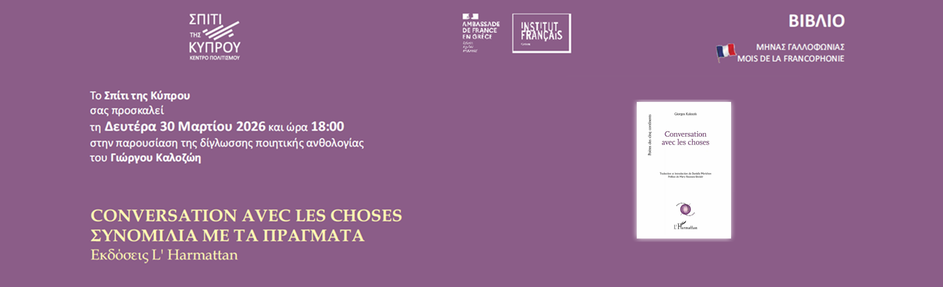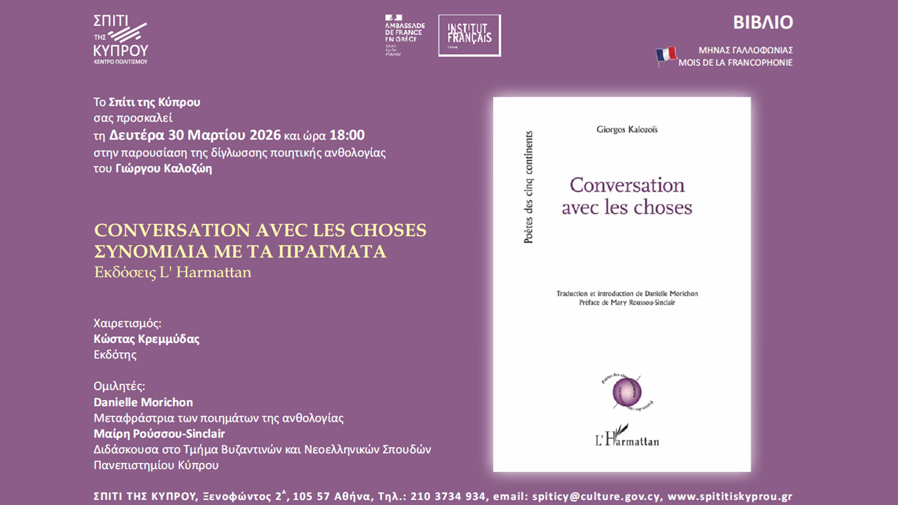 Το Σπίτι της Κύπρου σας προσκαλεί τη Δευτέρα 30 Μαρτίου 2025 και ώρα 18:00 στην παρουσίαση της δίγλωσσης ποιητικής ανθολογίας του Γιώργου Καλοζώη : «CONVERSATION AVEC LES CHOSES | ΣΥΝΟΜΙΛΙΑ ΜΕ ΤΑ ΠΡΑΓΜΑΤΑ» Εκδόσεις L' Harmattan