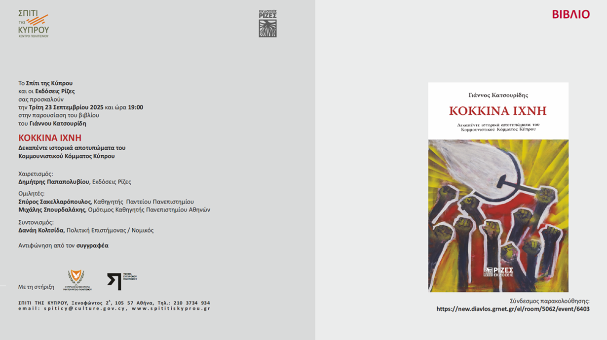 Το Σπίτι της Κύπρου και οι Εκδόσεις Ρίζες σας προσκαλούν την Τρίτη 23 Σεπτεμβρίου 2025 και ώρα 19:00 στην παρουσίαση του βιβλίου του Γιάννου Κατσουρίδη : «ΚΟΚΚΙΝΑ ΙΧΝΗ. Δεκαπέντε ιστορικά αποτυπώματα του Κομμουνιστικού Κόμματος Κύπρου»