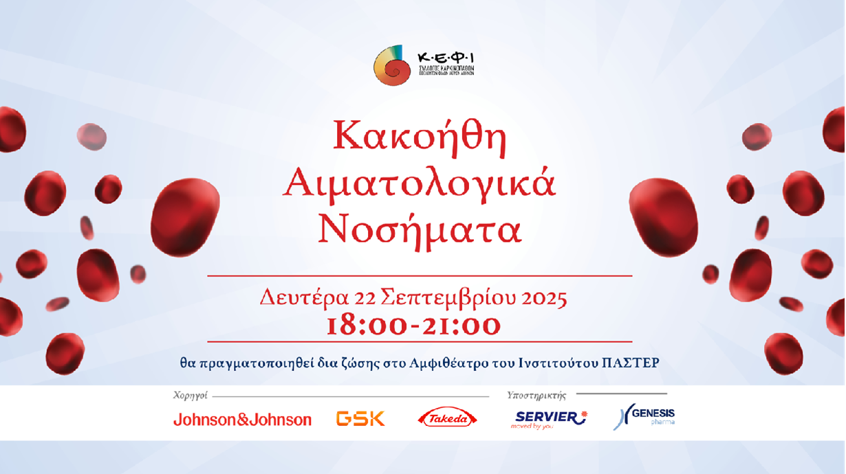 Ο Σύλλογος Καρκινοπαθών, Εθελοντών, Φίλων, Ιατρών «Κ.Ε.Φ.Ι.» διοργανώνει Επιστημονική Ημερίδα με θέμα «ΚΑΚΟΗΘΗ ΑΙΜΑΤΟΛΟΓΙΚΑ ΝΟΣΗΜΑΤΑ», η οποία θα πραγματοποιηθεί την Δευτέρα 22 Σεπτεμβρίου 2025 και ώρα 18:00 – 21:00 στο αμφιθέατρο του Ελληνικού Ινστιτούτο ΠΑΣΤΕΡ (Βασιλίσσης Σοφίας 127, Αθήνα 11521).