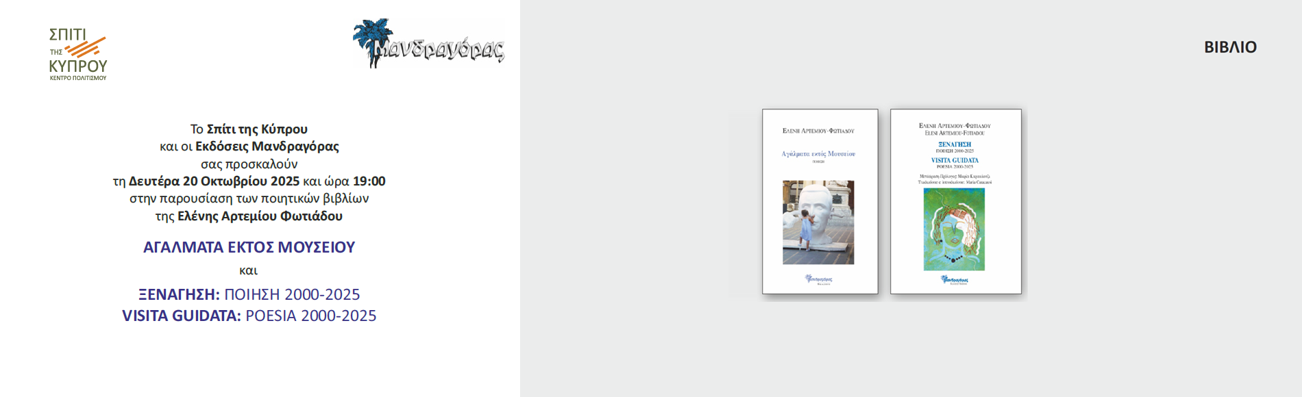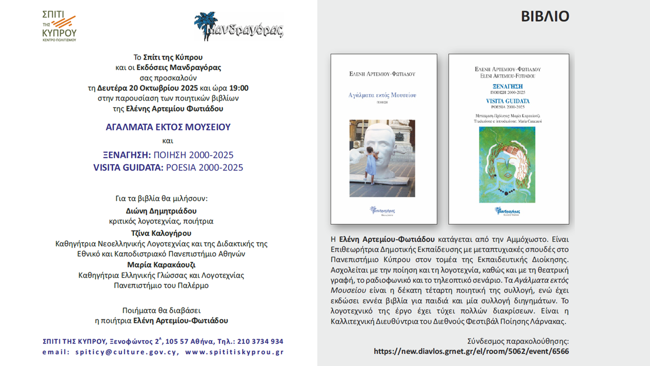 Το Σπίτι της Κύπρου και οι Εκδόσεις Μανδραγόρας σας προσκαλούν τη Δευτέρα 20 Οκτωβρίου 2025 και ώρα 19:00 στην παρουσίαση των ποιητικών βιβλίων της Ελένης Αρτεμίου Φωτιάδου