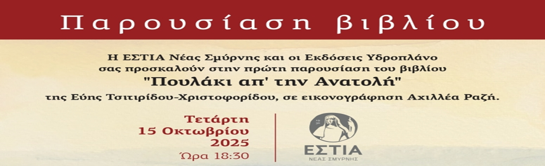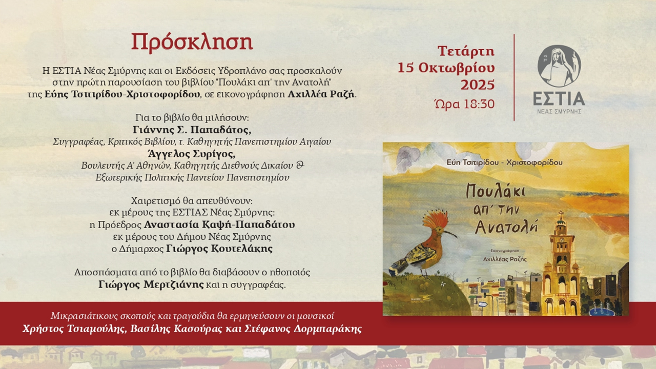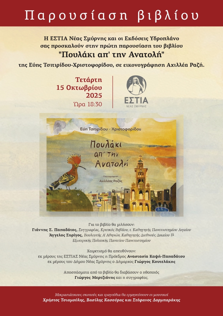 Η ΕΣΤΙΑ Νέας Σμύρνης και οι Εκδόσεις Υδροπλάνο σας προσκαλούν στην πρώτη παρουσίαση του βιβλίου «Πουλάκι απ’ την Ανατολή» της Εύης Τσιτιρίδου-Χριστοφορίδου, σε εικονογράφηση Αχιλλέα Ραζή.