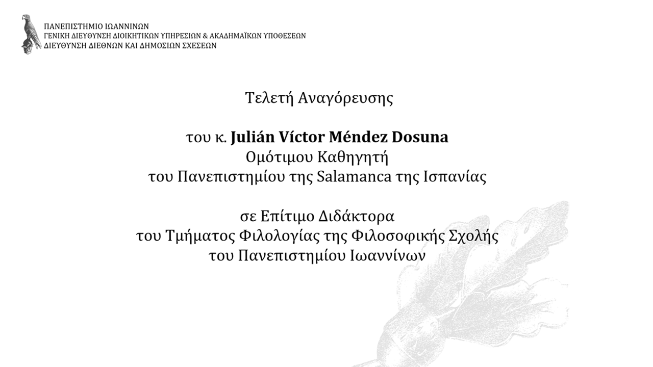 Η Πρύτανης του Πανεπιστημίου Ιωαννίνων, Καθηγήτρια κυρία Άννα Κ. Μπατιστάτου, έχει την τιμή να σας προσκαλέσει στην Τελετή Αναγόρευσης του κ. Julián Víctor Méndez Dosuna, Oμότιμου Καθηγητή του Πανεπιστημίου της Salamanca της Ισπανίας σε Επίτιμο Διδάκτορα του Τμήματος Φιλολογίας της Φιλοσοφικής Σχολής του Πανεπιστημίου Ιωαννίνων.