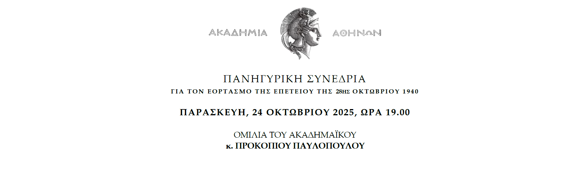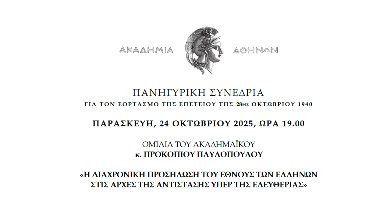 Πανηγυρική Συνεδρία της Ακαδημίας Αθηνών για τον Εορτασμό της Επετείου της 28ης Οκτωβρίου 1940, η οποία θα πραγματοποιηθεί την Παρασκευή, 24 Οκτωβρίου 2025 και ώρα 19.00, στην Αίθουσα Τελετών της Ακαδημίας.