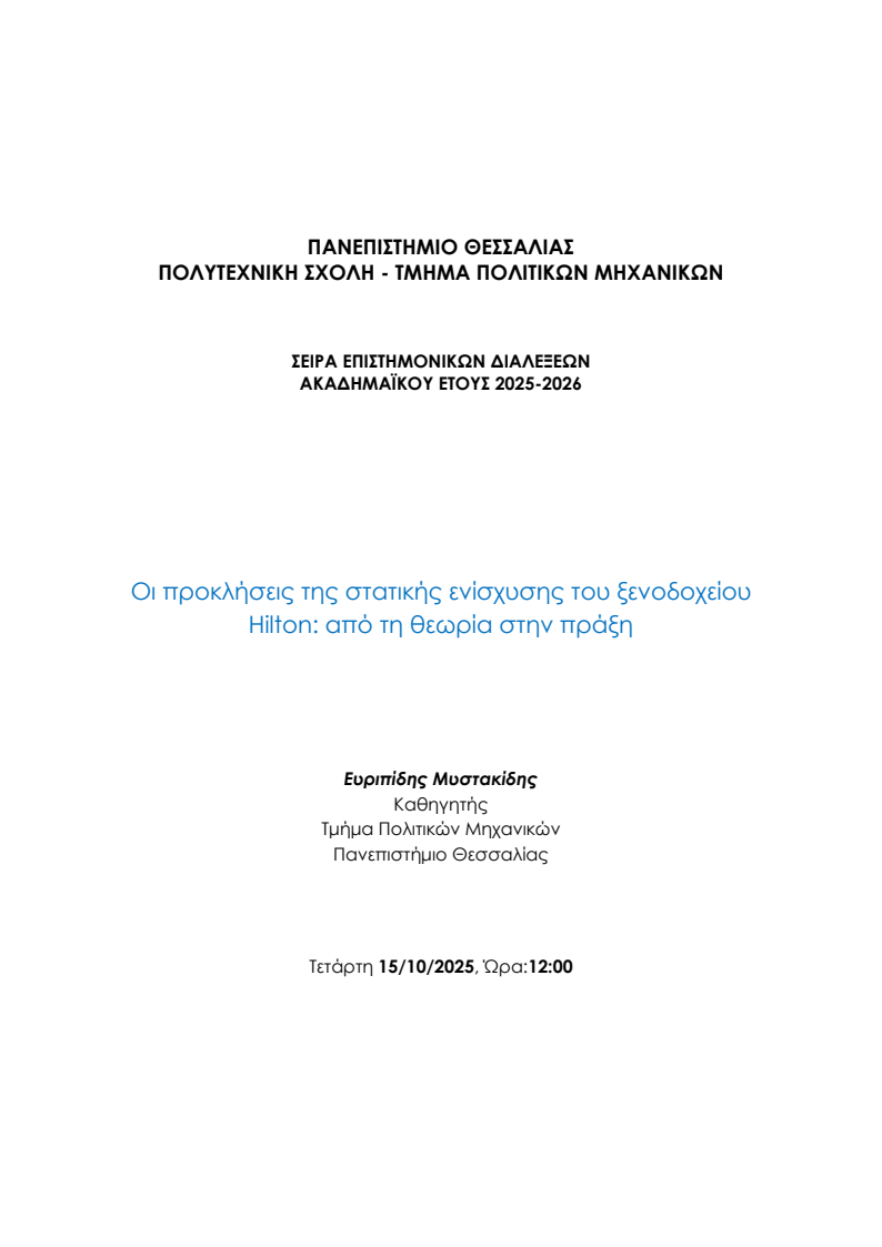 Το Τμήμα Πολιτικών Μηχανικών του Πανεπιστημίου Θεσσαλίας, στο πλαίσιο της Σειράς Επιστημονικών Διαλέξεων, πραγματοποιεί διαδικτυακά την επιστημονική διάλεξη του Καθηγητή του Πανεπιστημίου Θεσσαλίας Ευριπίδη Μυστακίδη με θέμα «Οι προκλήσεις της στατικής ενίσχυσης του ξενοδοχείου Hilton: από τη θεωρία στην πράξη».