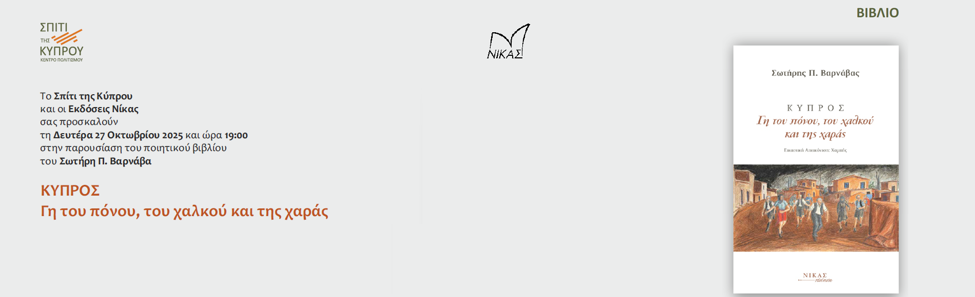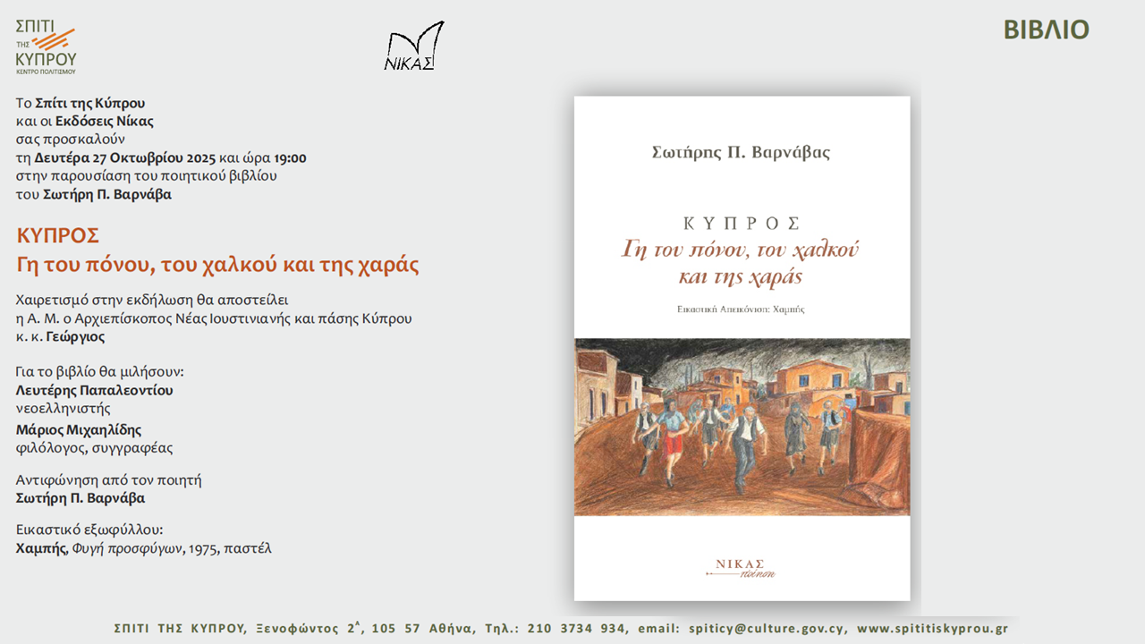 Το Σπίτι της Κύπρου και οι Εκδόσεις Νίκας σας προσκαλούν τη Δευτέρα 27 Οκτωβρίου 2025 και ώρα 19:00 στην παρουσίαση του ποιητικού βιβλίου του Σωτήρη Π. Βαρνάβα : «ΚΥΠΡΟΣ Γη του πόνου, του χαλκού και της χαράς»