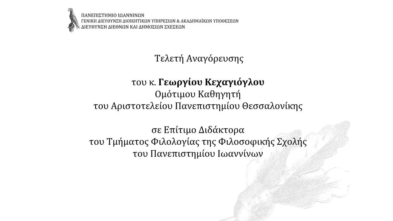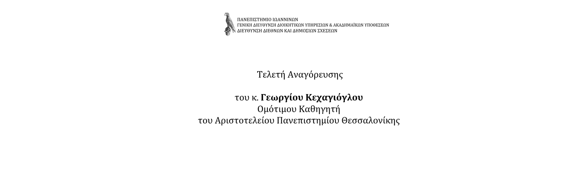 Πρύτανης του Πανεπιστημίου Ιωαννίνων, Καθηγήτρια κυρία Άννα Κ. Μπατιστάτου, έχει την τιμή να σας προσκαλέσει στην Τελετή Αναγόρευσης του Ομότιμου Καθηγητή του Αριστοτελείου Πανεπιστημίου Θεσσαλονίκης κ. Γεωργίου Ι. Κεχαγιόγλου σε Επίτιμο Διδάκτορα του Τμήματος Φιλολογίας της Φιλοσοφικής Σχολής του Πανεπιστημίου Ιωαννίνων.
