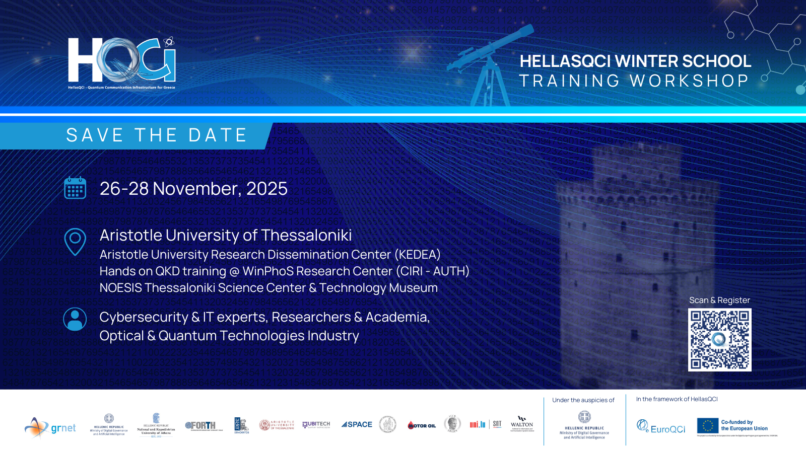 Continuing the successful series of training events in Athens and Crete, HellasQCI – a European co-funded project coordinated by GRNET – is proudly launching the HellasQCI Winter School (Training Workshop) 2025, in Thessaloniki; a FREE three-day training workshop on Quantum Key Distribution (QKD) and Space-based QKD technologies, combining theory, hands-on lab experience, and expert-led sessions.