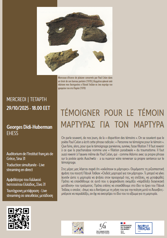 Στις μέρες μας λέγεται συχνά ότι «εκλείπουν οι μάρτυρες». Θυμόμαστε τη ριζοσπαστική φράση του ποιητή Πάουλ Τσέλαν: «Ουδείς μαρτυρεί για τον μάρτυρα». Τι μπορεί να γίνει λοιπόν ώστε η μαρτυρία να φτάσει στον προορισμό της, να επιζήσει, να μεταφερθεί; Πρέπει να επανέλθουμε σε αυτό που η ψυχανάλυση ονομάζει «παράδοξη διαγενεακή μετάδοση» του τραύματος. Πρέπει επίσης να επανέλθουμε στο ίδιο το έργο του Πάουλ Τσέλαν, ο οποίος –όπως και ο Αντόρνο με τη ρήση του για την ποίηση μετά το Άουσβιτς– μπόρεσε να παραλλάξει, αν όχι να ανατρέψει το ίδιο του το αξίωμα για τη μαρτυρία.