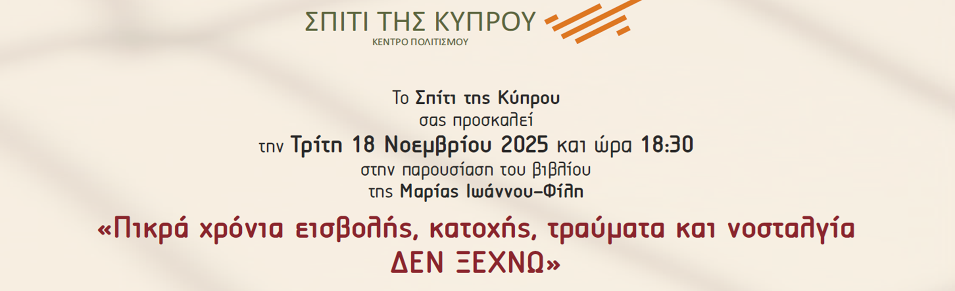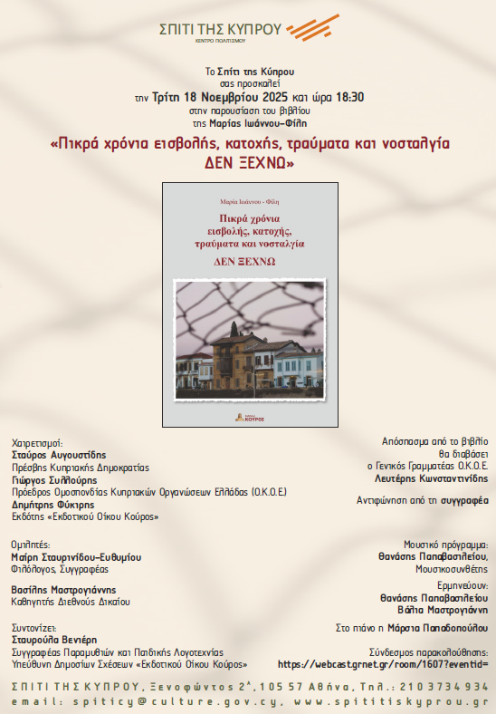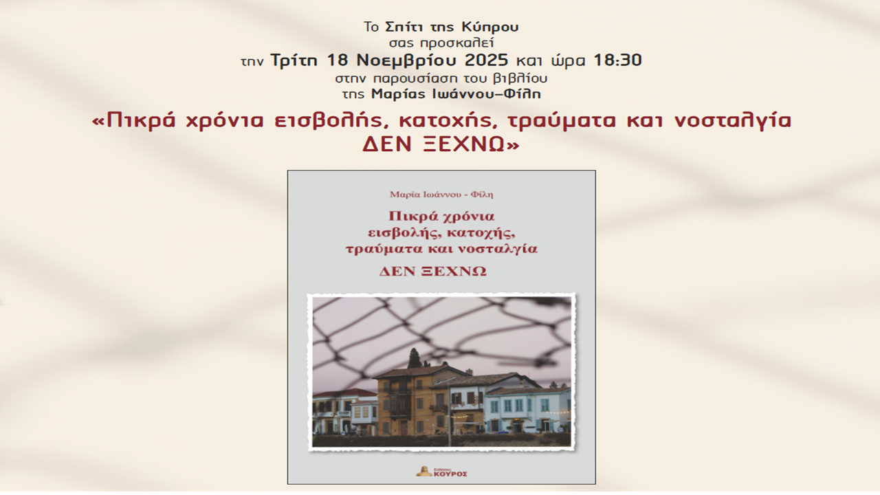 Το Σπίτι της Κύπρου σας προσκαλεί την Τρίτη 18 Νοεμβρίου 2025 και ώρα 19:00 στην παρουσίαση του βιβλίου της Μαρίας Ιωάννου-Φίλη «Πικρά χρόνια εισβολής, κατοχής, τραύματα και νοσταλγία ΔΕΝ ΞΕΧΝΩ»