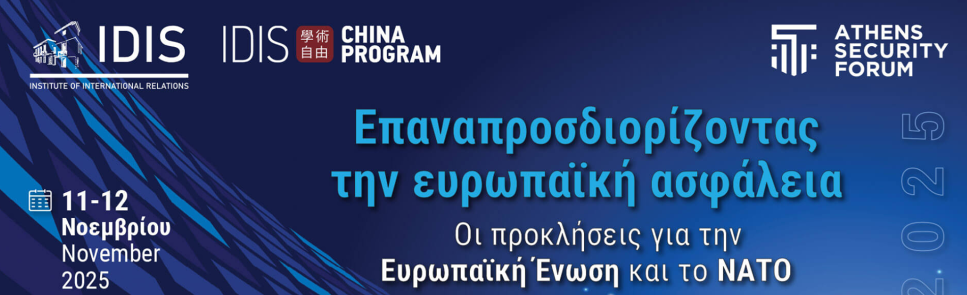 Το Athens Security Forum, η κορυφαία ετήσια συνάντηση του Ινστιτούτου Διεθνών Σχέσεων (ΙΔΙΣ), διοργανώνεται φέτος σε μια εξαιρετικά κομβική για την ευρωπαϊκή και ευρω-ατλαντική ασφάλεια συγκυρία και θα δώσει ιδιαίτερη έμφαση στις ανακατατάξεις στην ήπειρο μας και την Ανατολική Μεσόγειο. Στο σταυροδρόμι των συγκρούσεων στη Μέση Ανατολή και την Ουκρανία, η περιοχή βρίσκεται αντιμέτωπη με την αναθεώρηση στρατηγικών προτεραιοτήτων, συμμαχιών και αντίληψης απειλών. Το Athens Security Forum 2025 θα διερευνήσει πως περιφερειακοί παράγοντες, κρατικοί και μη, επανατοποθετούνται σε ένα μεταβαλλόμενο γεωπολιτικό τοπίο. Στην ατζέντα του θα βρεθούν ζητήματα στρατηγικής, αλληλεξάρτησης, συσχετισμού δυνάμεων, και θα εξετασθεί πως η μεταβαλλόμενη δυναμική ισχύος αναδιαμορφώνει το περιβάλλον ασφαλείας στη νότια Ευρώπη. Θα συζητήσουν για τα κρίσιμα αυτά ζητήματα έγκυροι αναλυτές, πολιτικοί και ακαδημαϊκοί από την Ελλάδα και κορυφαία αμερικανικά και ευρωπαϊκά επιστημονικά ιδρύματα .