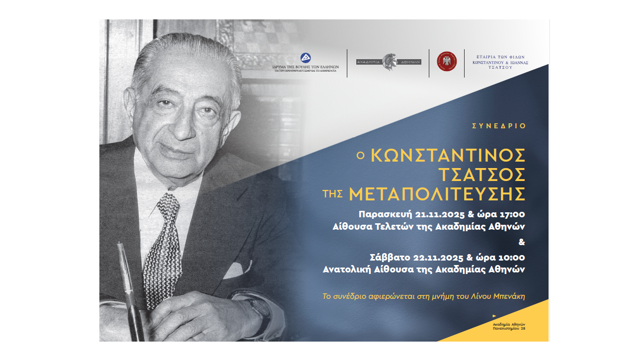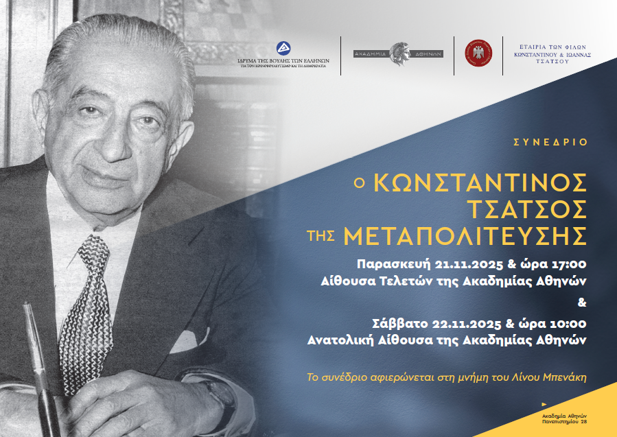 Το Ίδρυμα της Βουλής των Ελλήνων για τον Κοινοβουλευτισμό και τη Δημοκρατία, η Ακαδημία Αθηνών, το Κέντρο Βυζαντινών, Νεοελληνικών και Κυπριακών Σπουδών του Πανεπιστημίου της Γρανάδας και η Εταιρία των Φίλων Κωνσταντίνου και Ιωάννας Τσάτσου,σας προσκαλούν σε συνέδριο με θέμα
