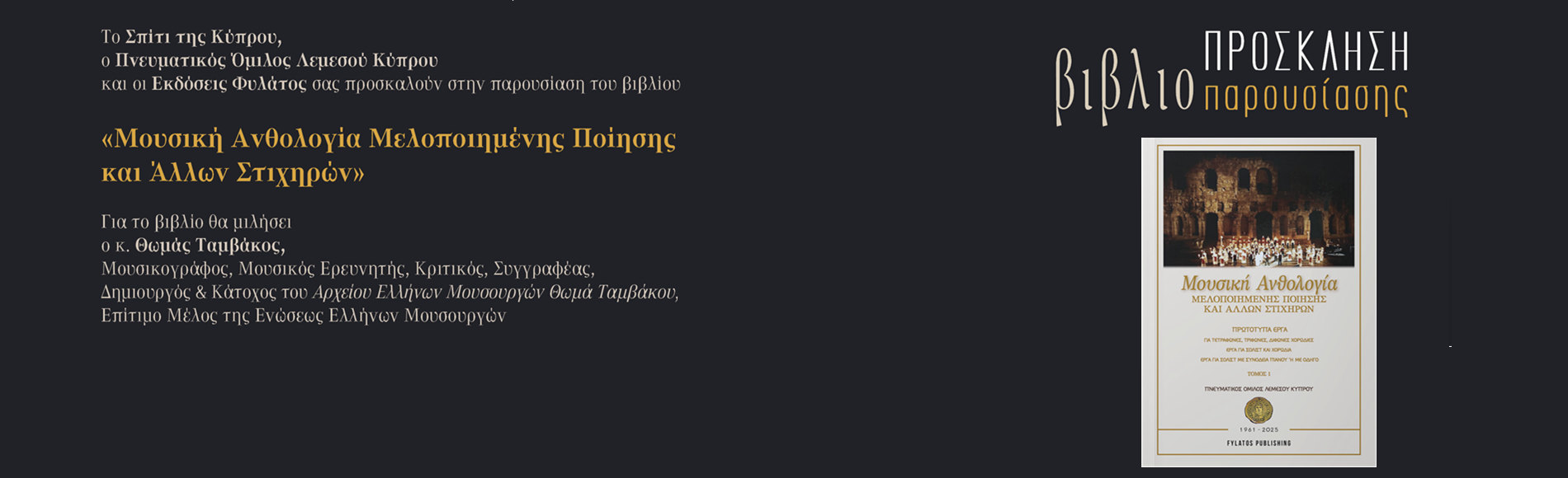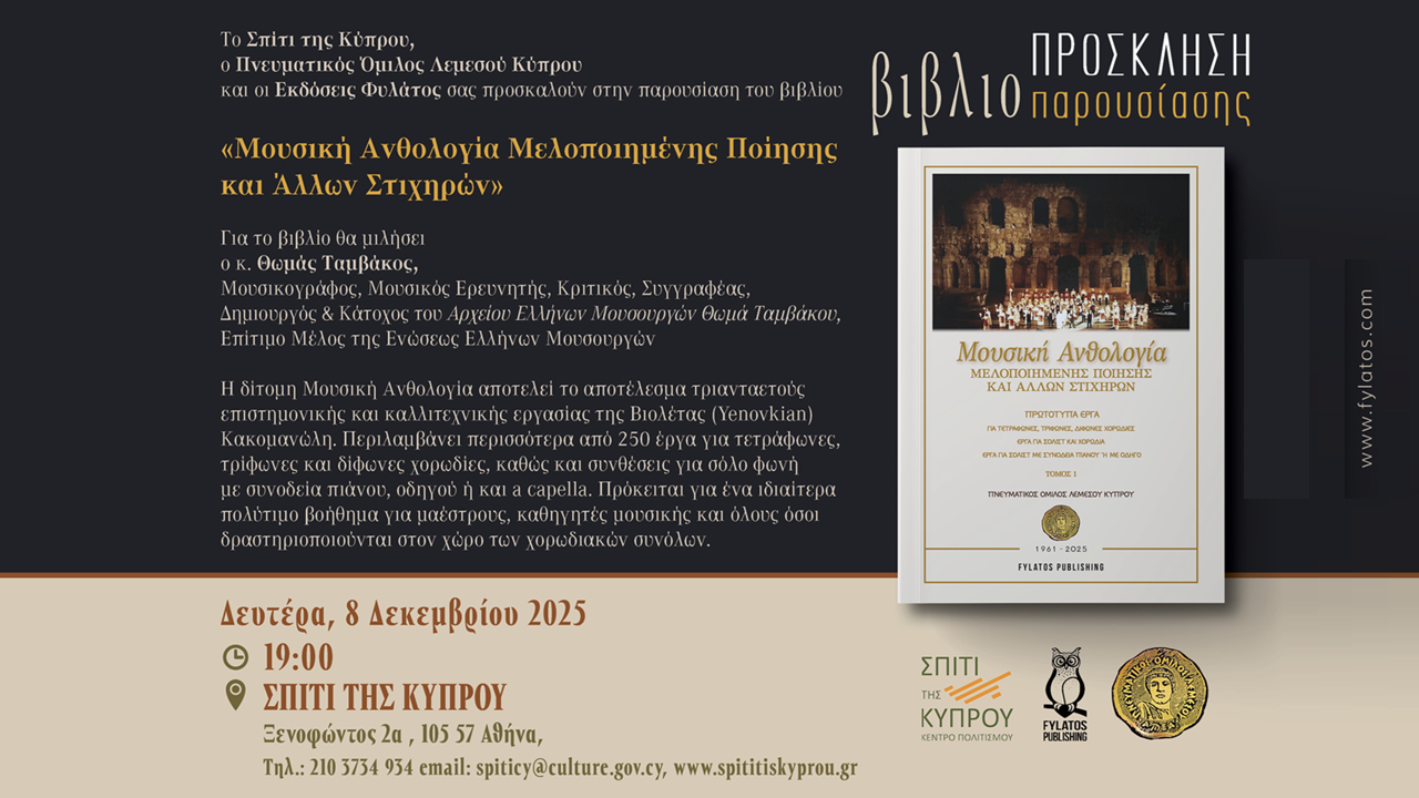 Το Σπίτι της Κύπρου, ο Πνευματικός Όμιλος Λεμεσού Κύπρου και οι Εκδόσεις Φυλάτος σας προσκαλούν στην παρουσίαση του βιβλίου