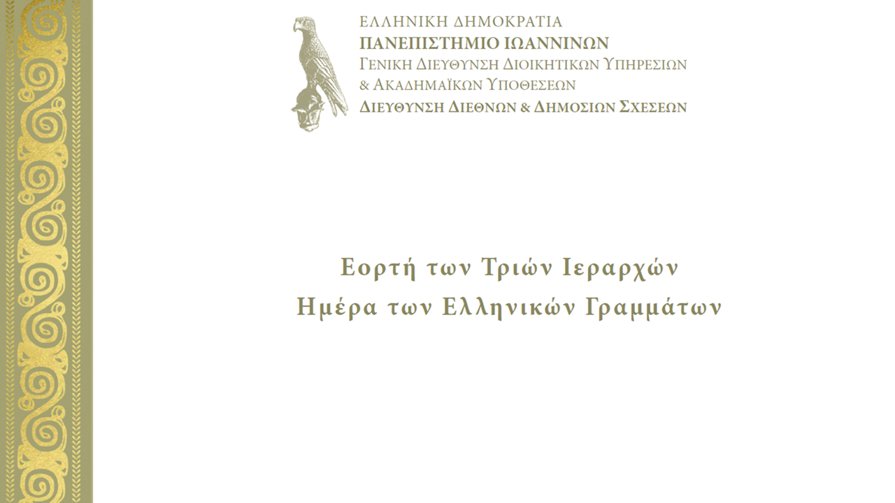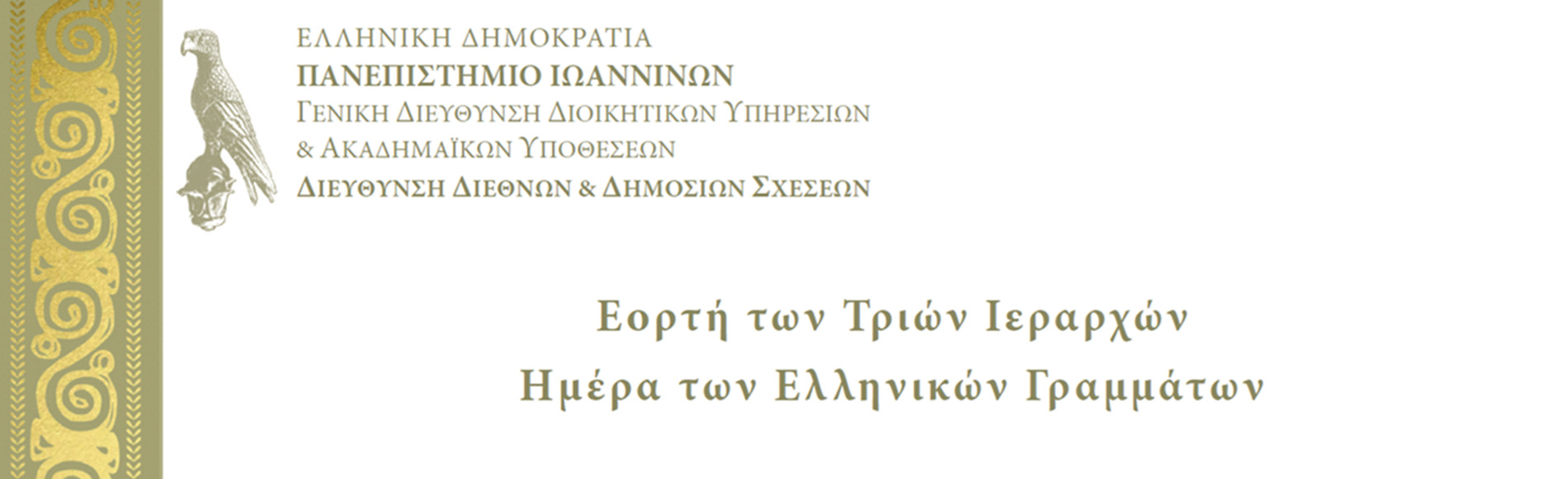 Η πρύτανης του πανεπιστημίου Ιωαννίνων, Καθηγήτρια κυρία Άννα Κ. Μπατιστάτου, σας προσκαλεί στην Εορτή των Τριών Ιεραρχών, Ημέρα των Ελληνικών Γραμμάτων, το Σάββατο 31 Ιανουαρίου 2026 και ώρα 18.30, στην Αίθουσα Τελετών «Γεώργιος Μυλωνάς» του πανεπιστημίου.