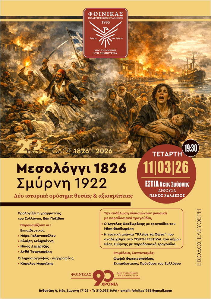Η εκδήλωση πραγματοποιείται στο πλαίσιο της συμπλήρωσης 200 ετών από την Έξοδο του Μεσολογγίου (1826–2026) και αποτελεί αφιέρωμα μνήμης στα γεγονότα του Μεσολογγίου και της Σμύρνης, δύο κορυφαίες στιγμές της νεότερης ελληνικής ιστορίας που σφράγισαν τη συλλογική μας ταυτότητα.