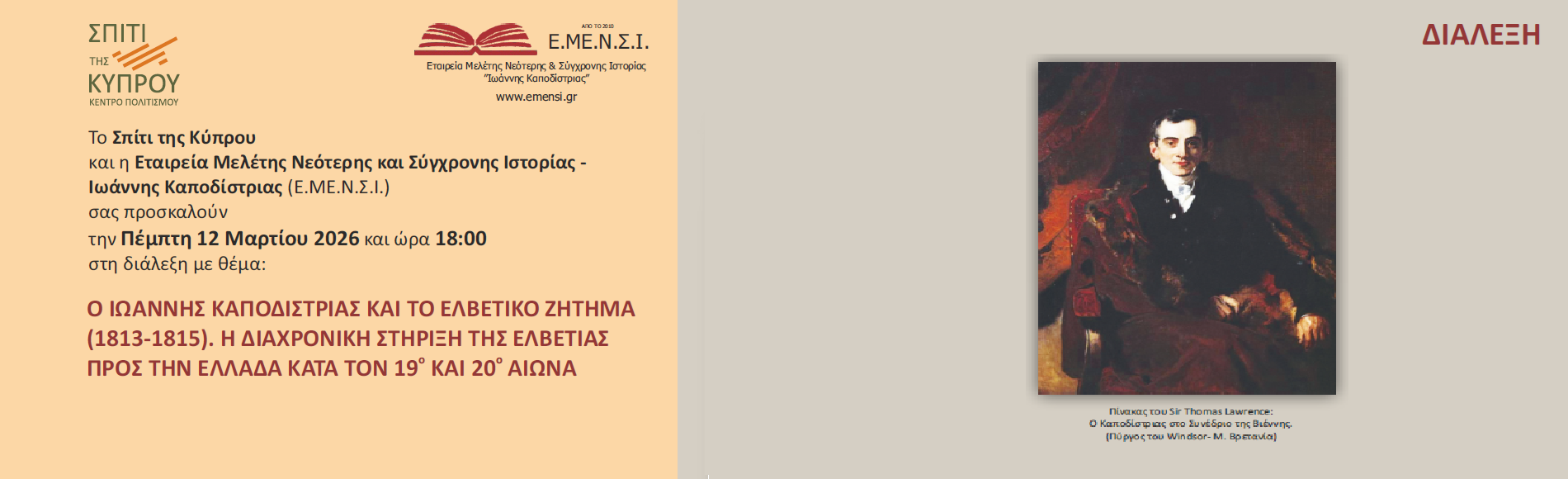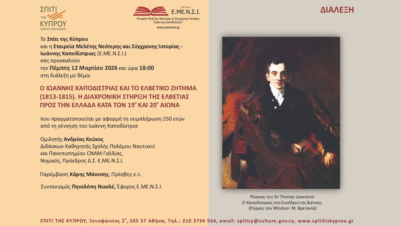 Το Σπίτι της Κύπρου και η Εταιρεία Μελέτης Νεότερης και Σύγχρονης Ιστορίας – Ιωάννης Καποδίστριας (Ε.ΜΕ.Ν.Σ.Ι.) σας προσκαλούν την Πέμπτη 12 Μαρτίου 2026 και ώρα 18:00 στη διάλεξη με θέμα: «Ο ΙΩΑΝΝΗΣ ΚΑΠΟΔΙΣΤΡΙΑΣ ΚΑΙ ΤΟ ΕΛΒΕΤΙΚΟ ΖΗΤΗΜΑ (1813-1815). Η ΔΙΑΧΡΟΝΙΚΗ ΣΤΗΡΙΞΗ ΤΗΣ ΕΛΒΕΤΙΑΣ ΠΡΟΣ ΤΗΝ ΕΛΛΑΔΑ ΚΑΤΑ ΤΟΝ 19ο ΚΑΙ 20ο ΑΙΩΝΑ» που πραγματοποιείται με αφορμή τη συμπλήρωση 250 ετών από τη γέννηση του Ιωάννη Καποδίστρια