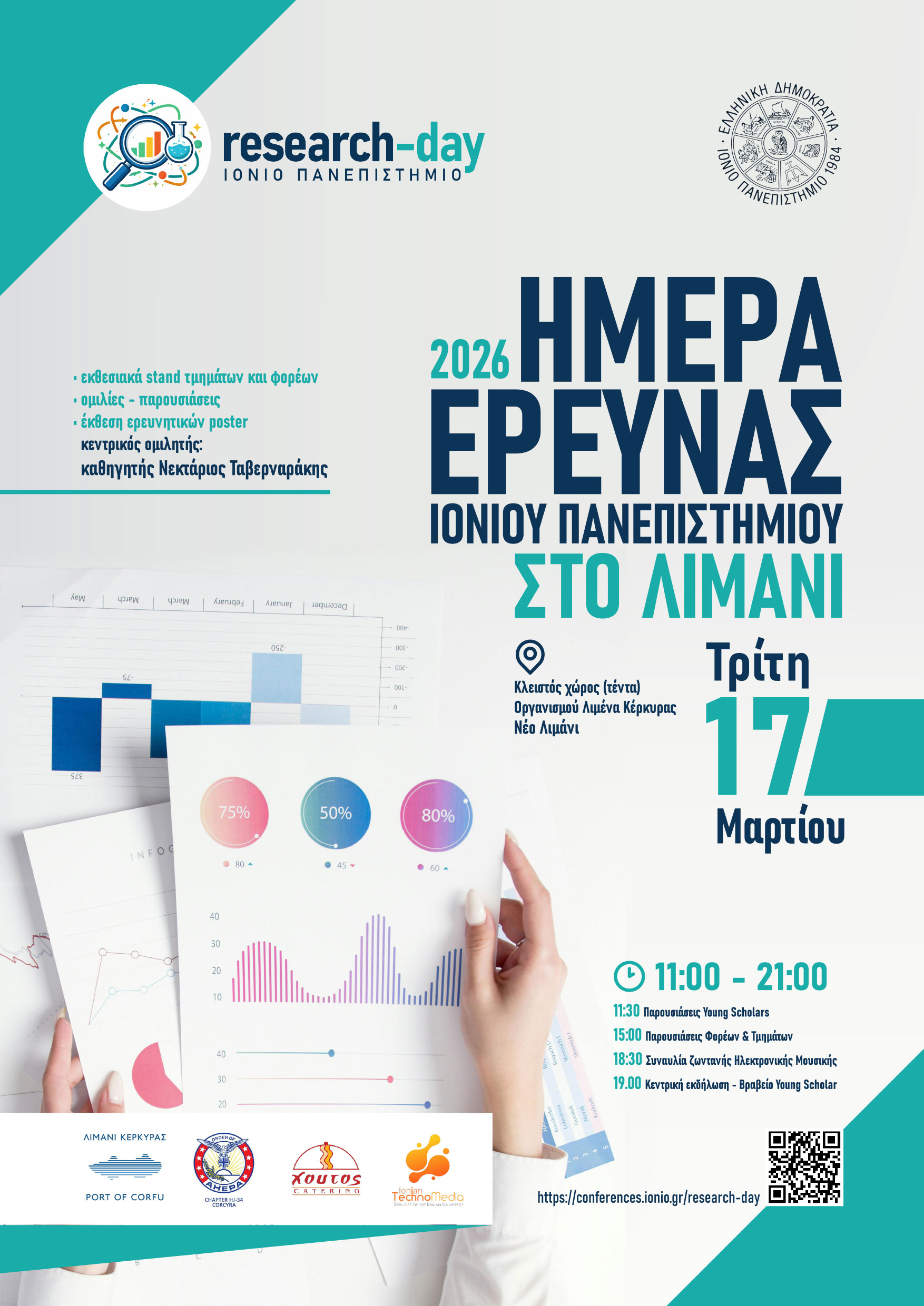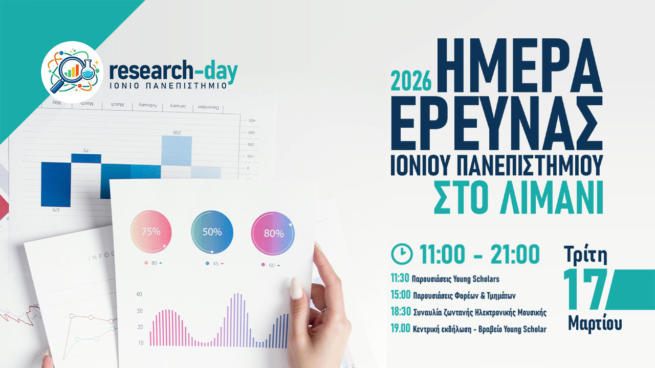 Το Ιόνιο Πανεπιστήμιο διοργανώνει την Ημέρα Έρευνας 2026 την Τρίτη 17 Μαρτίου 2026, μια ανοικτή εκδήλωση αφιερωμένη στην προβολή της επιστημονικής γνώσης, της δημιουργικότητας και της καινοτομίας που παράγεται στο Ίδρυμα.