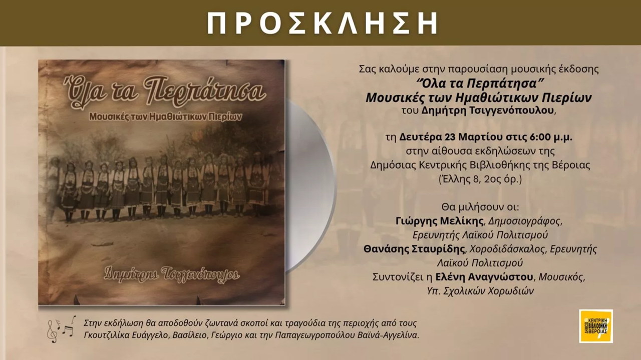 Η Δημόσια Κεντρική Βιβλιοθήκη της Βέροιας σας προσκαλεί στην παρουσίαση της μουσικής έκδοσης «Όλα τα Περπάτησα – Μουσικές των Ημαθιώτικων Πιερίων» του ερευνητή και μουσικού Δημήτρη Τσιγγενόπουλου.